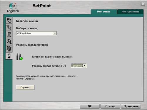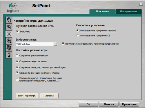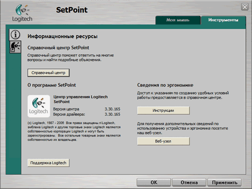 Во время эксплуатации использовались версии 3.1 и 3.3. ПО выглядит идентично и под Windows XP, и под Vista. Из непонятных отличий между версиями привлекло внимание то, что под 3.1 можно выставить намного большую чувствительность мыши, то есть скорость перемещения по экрану. На особенностях Vista остановлюсь в следующей статье, посвящённой MX Revolution — там они более актуальны. Драйвер версии 3.3 работоспособен под управлением обеих ОС. Установив его один раз, можно подключать любую из мышей, а также обе одновременно, есть возможность выбора мыши для настроек. При физическом отсутствии ресивера в порту драйвер не загружается.