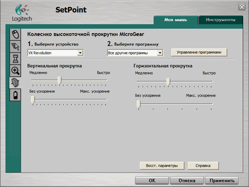 Пятая закладка посвящена скорости и ускорению горизонтальной и вертикальной прокрутки, к ней наибольшие претензии. Почему-то здесь после каждого обращения к любой закладке программы настройки норовят сброситься в default, что особенно раздражает, поскольку удобные настройки очень сильно отличаются от default (средняя скорость прокрутки, никакого ускорения). Никогда не известно, у какой из программ произойдёт сброс. Частично избавиться от проблемы удалось удалением всех программ из списка и заданием единых глобальных настроек, теперь хотя бы можно было возвращаться к своим предпочтениям из одной точки входа.