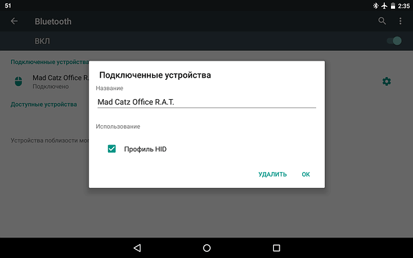 При подключении к планшету ASUS Nexus 7 2013 (версия Android 5.1) мышь определяется как Mad Catz R.A.T. TE, используется профиль HID.
