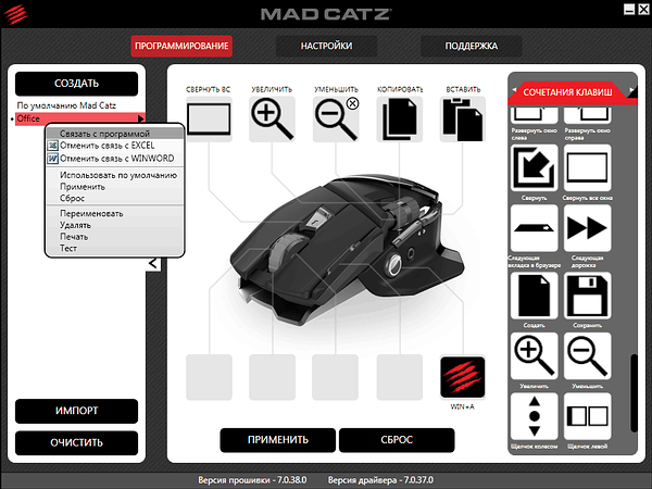 Программная поддержка реализована посредством собственных виртуальных устройств, поэтому к Mad Catz Office R.A.T. Wireless в разделе Мыши и иные указывающие устройства
