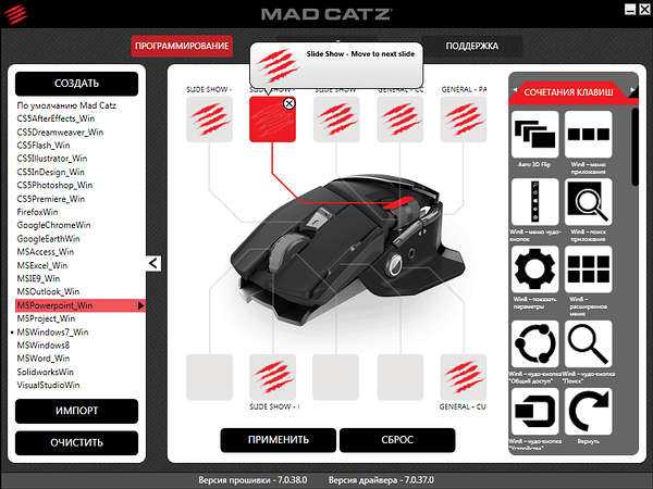 Несмотря на отсутствие Mad Catz Office R.A.T. в разделе загрузки официального сайта, можно скачать набор «Non-Gaming Profile Pack» с поддержкой Microsoft Office, Adobe CS5 и других программ, для установки достаточно скопировать содержимое архива в папку C:UsersВсе пользователиDocumentsMad CatzOffice R.A.T или C:UsersPublicDocumentsMad CatzOffice R.A.T в зависимости от языка операционной системы.