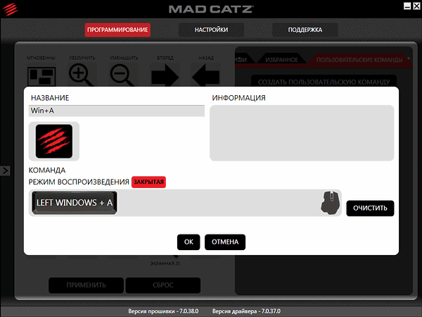 При тестировании использовались драйверы версии 7.0.37.0 и ПО (в локализованном варианте почему-то называемое «прошивкой» вместо «Software version», хотя возможности обновления таковой Mad Catz Office R.A.T. не имеет, как и встроенной памяти) версии 7.0.38.0.