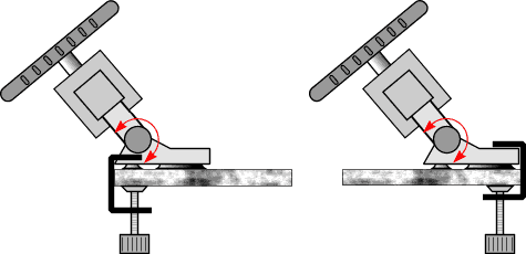 …Принеся свежекупленный руль домой, я начал с того, что прикрепил его к столу. Самым удобным оказалось разместить его на полочке с клавиатурой и мышкой. Конечно, можно было и не городить огород, а воспользоваться только присосками. Надо сказать, что держат они неплохо, но со струбциной как-то надежнее. Окончательный вариант был таким: полочка выдвинута до упора и зафиксирована, основание руля прикручено струбциной к ее дальней грани под углом. Для удобства читателей я нарисовал схемку, на которой видны возможные варианты крепления. Кстати, на полочке еще уместились и клавиатура, и мышь!