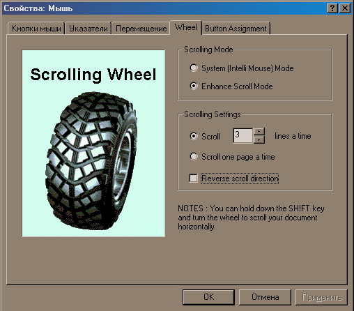 На первой дополнительной закладке можно настроить параметры работы колесика прокрутки — системный режим либо расширенный. Чем они отличаются, я затрудняюсь ответить, так как явной разницы ни сразу, ни в процессе работы не заметил. Попытка погонять мышь в различных приложениях, в различных режимах тоже не показала какой-либо ощутимой разницы.