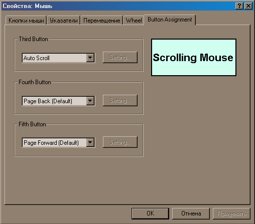 При вызове пункта "Setting" в контекстном меню значка появляется стандартная панель настройки мыши с двумя дополнительными закладками.