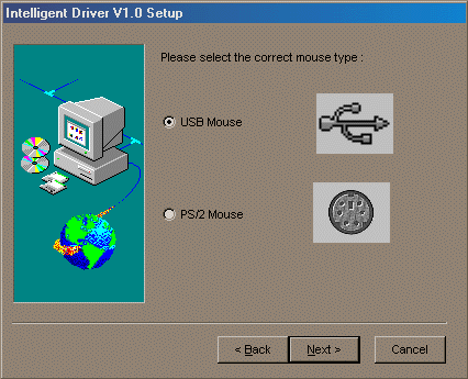 Итак, дискета снова в дисководе, запускаем файл Setup из корневой директории. Появляется стандартное окно установки нового софта. На втором экране установки предлагается выбрать способ подключения мышки — PS/2 или USB.