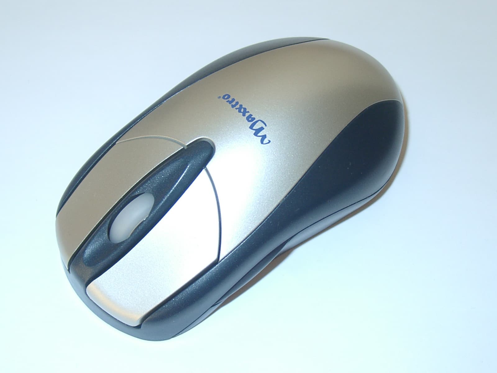 Вот перед вами и сама мышь! Под стать приемнику, ее темный серо-синий корпус декорирован стильной серебристой вставкой. Колесо прокрутки покрыто качественной нескользкой резиной молочного цвета. Мышь пятикнопочная, и две ее дополнительных кнопки расположены симметрично на боковых стенках корпуса. Сделанные из черного пластика, они практически не выделяются на общем фоне, и при первом взгляде на мышь можно подумать, что она трехкнопочная. Корпус Maxxtro Radio Wireless Mouse симметричен, так что работать с ней одинаково удобно как правой, так и левой рукой. Удобно, но небольшие нарекания к дизайну у меня все же возникли. Форма и длина двух основных кнопок вполне меня устроили, а вот их ширина, как мне кажется, должна быть немного больше. Расположение дополнительных кнопок, при их симметрии, позволяет удобно пользоваться только одной из них. Расположить руку так, чтобы одна из этих кнопок была под большим пальцем, а вторая под мизинцем, и при этом было бы удобно держать мышь, мне так и не удалось. Но, этот недостаток нельзя считать значительным, ведь если сместить одну из кнопок, то мышь перестанет быть симметричной, и круг ее пользователей несколько уменьшится. Да и во время работы вам вряд ли могут понадобиться одновременно обе дополнительные кнопки. В общем, даже учитывая два небольших недостатка, описанные мною, внешность Maxxtro Radio Wireless Mouse мне понравилась. А вот с внутренностями дело обстоит несколько иначе.