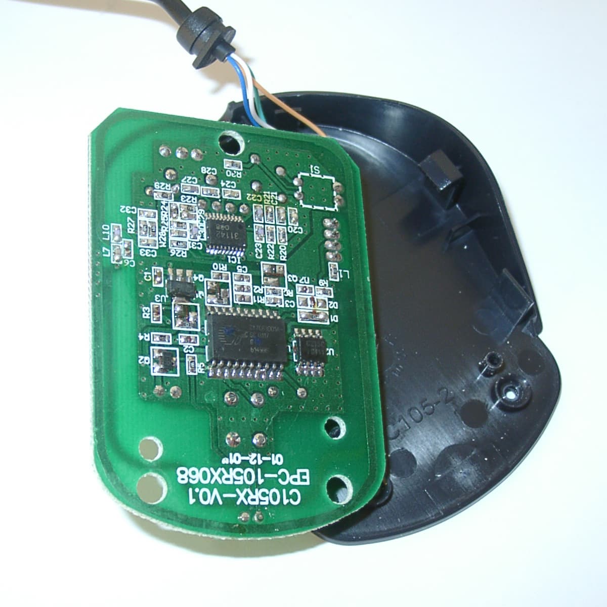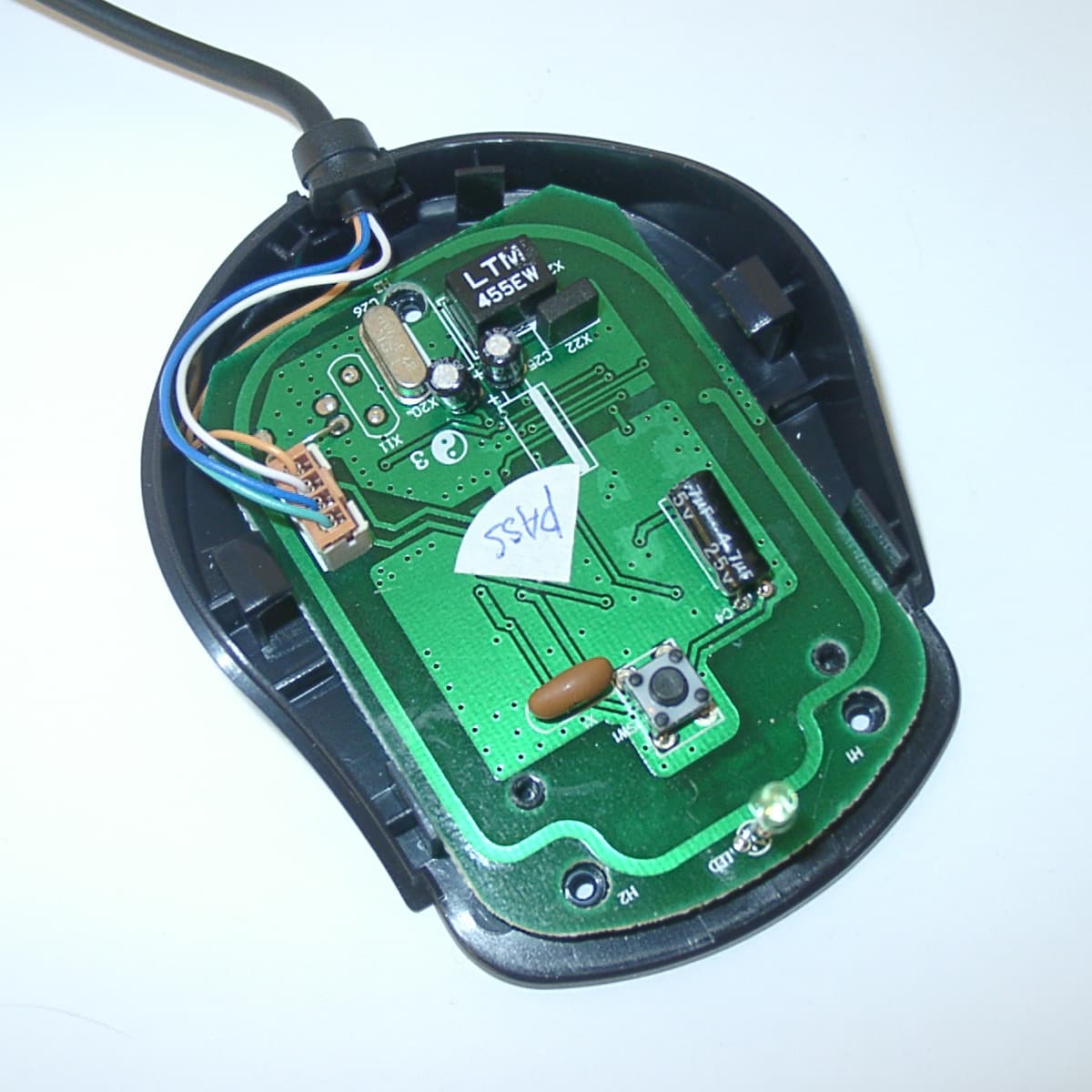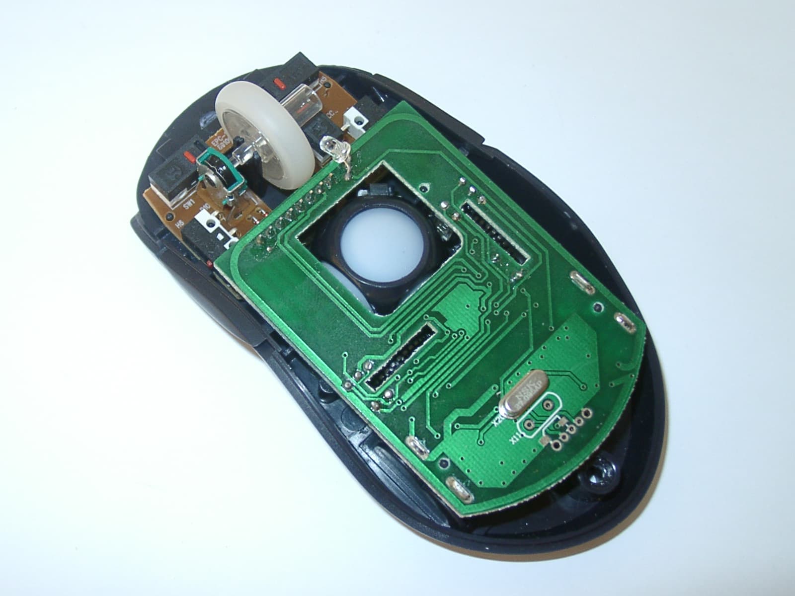 Внутри приемника расположена одна печатная плата, на которой собрана вся его электрическая схема, а интерфейсный кабель (длина 1 м) соединяется с ней через разъем. Надпись на упаковке мыши гласит, что ее приемник двухканальный — таким он изначально и проектировался. Но место, отведенное на печатной плате под переключатель радиоканалов, пустует. Вместо него в плату впаяна перемычка, и на самом деле приемник может работать только в одном радиоканале 27MHz. Вот, собственно, и все, что я хотел бы поведать о приемнике Maxxtro Radio Wireless Mouse, ибо считаю саму мышь гораздо более интересным объектом и хотел бы поскорее перейти к ее описанию.