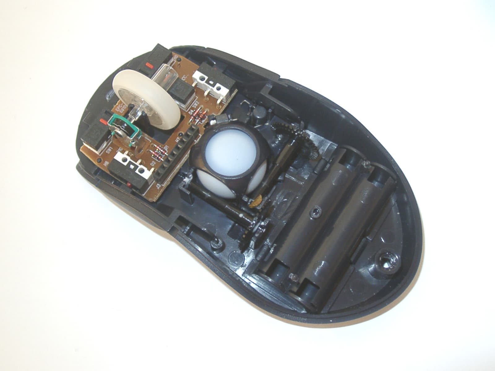 Более ничего особенного или необычного внутри рассматриваемой мыши нет. Вполне обычный шар (диаметр 22 мм) закрыт неким подобием купола. Подобием потому, что формой своей он, конечно, купол, но наличие в нем достаточно больших отверстий сводит к минимуму его свойство защиты оптико-механической части мыши от различной пыли и грязи. Диски этой системы имеют по 37 слотов, а заявленная производителем разрешающая способность мыши составляет 420 dpi. Батарейный отсек для двух элементов AAA расположен в нижней части корпуса. Кстати, в моем случае в комплекте с мышью поставлялись достаточно хорошие алкалиновые элементы питания (Gassner Alkaline). Вот только указать где-либо срок службы одного комплекта питания производитель, к сожалению, не соизволил.