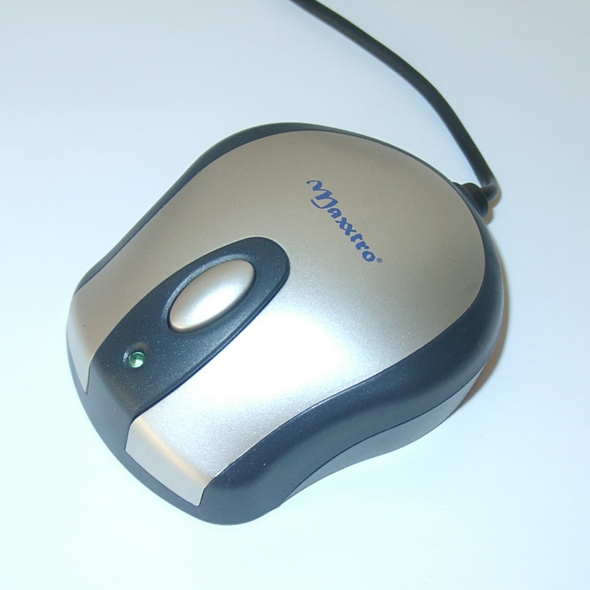 Как я уже писал, приемник Maxxtro Radio Wireless Mouse очень похож на небольшую мышь. Небольшой темный серо-синий корпус с серебристой декоративной вставкой на верхней крышке своими обводами напоминает некоторые модели миниатюрных детских мышек. Серебристая кнопка Connect так же расположена на верхней крышке и своим расположением, формой и размерами очень похожа на обычное мышиное колесо прокрутки. Но, все же приемник себя выдает. Взглянув на него внимательно, даже если он не подключен, вы заметите, что интерфейсный кабель «растет» не с той стороны корпуса, с коей он должен «расти» у любой приличной мыши. Во включенном же состоянии, в глаза сразу бросается яркий светодиодный индикатор зеленого свечения, расположенный на верней крышке корпуса перед кнопкой Connect. Когда мышь не двигается, индикатор спокойно горит. А вот в моменты активности мыши он начинает подмаргивать вам, показывая, что мышь работает. При достаточно большой яркости свечения диода и частом его моргании, он весьма быстро начинает утомлять своим присутствием (если, конечно, приемник находится в поле вашего зрения), и я бы рекомендовал заклеить его, например, куском непрозрачной изоляционной ленты.