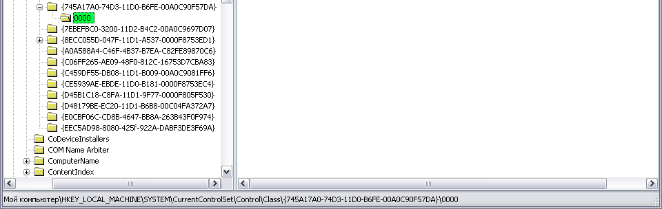 Для Windows семейства NT ищем в реестре «HKLMSYSTEMCurrentControlSetControlClass{745A17A0-74D3-11D0-B6FE- 00A0C90F57DA}00(n)».