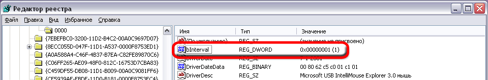 Далее в этих вышеназванных ключах ищем параметр типа DWORD именуемый «bInterval», а если его вдруг там не оказывается, то создаем его.