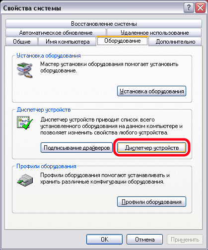 В появившемся окне кликаем на кнопку «Диспетчер устройств» (после установки SP2 эта кнопка находится выше, на месте кнопки «Установка оборудования» этого рисунка).