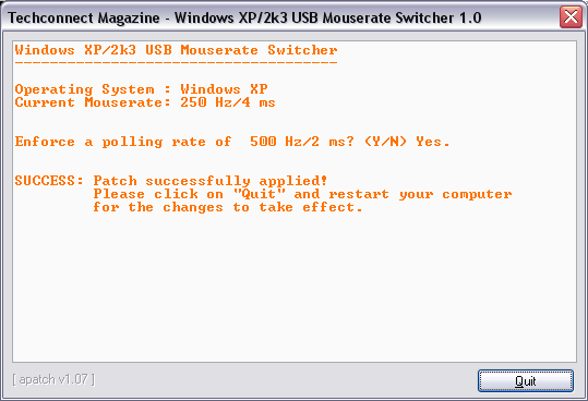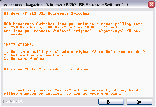 При желании увеличить частоту опроса мыши, внеся изменения в файл usbport.sys, пользователь должен нажать кнопку Patch на первом рабочем окне программы.