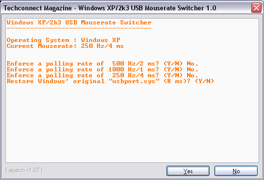 После чего появляется второе окно, в котором нам последовательно предложат варианты «оверклокинга» USB-мыши. Для выбора того или иного из вариантов нужно нажать Yes когда именно он будет предложен. Для отказа и выбора следующего варианта нужно, соответственно, жать No. Просто до невозможности, хотя сама «линейность» программы в нынешние времена все же вызывает некоторый внутренний протест. По окончании «списка» опций возможен выход из программы, но не возврат к вариантам настроек. Для того чтобы добраться до вариантов возможных частот USB повторно, программу приходится перезапускать заново.