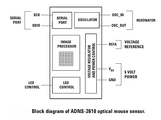 Общая схема анализа перемещений мыши не изменилась по сравнению с более ранними моделями — полученные блоком IAS сенсора микроснимки поверхности под мышью обрабатываются затем интегрированным в этой же микросхеме DSP (процессором), который определяет направление и дистанцию перемещения манипулятора. DSP вычисляет относительные величины смещения по координатам × и Y, относительно исходной позиции мыши. Затем внешняя микросхема контролера мыши (для чего он нужен, мы говорили ранее) считывает информацию о перемещении манипулятора с последовательного порта микросхемы оптического сенсора. Затем уже этот внешний контроллер транслирует полученные данные о направлении и скорости перемещения мыши в передаваемые по стандартным интерфейсам PS/2 или USB сигналы, которые уже от него поступают к компьютеру.