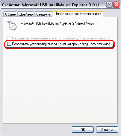 Кстати, если вы до сих пор боретесь с подобной проблемой, то она решается одним махом вот так: выбираем Мой Компьютер > Свойства > Оборудование > Диспетчер устройств > выбираем установленную мышь > заходим в ее «Свойства» > в появившемся окне переходим на закладку «Управление электропитанием» и снимаем галочку с пункта «Разрешить устройству вывод компьютера из ждущего режима» (рис. 4). После этого мышь уже не сможет вывести компьютер из режима ожидания ни под каким предлогом, даже если вы будете пинать ее ногами :)