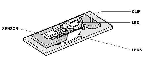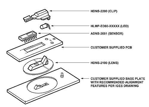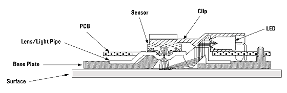 Однако, мы несколько отвлеклись от темы. Возвращаемся. В целом система оптического слежения мышей, помимо микросхемы-сенсора, включает еще несколько базовых элементов. Конструкция включает держатель (Clip) в который устанавливаются светодиод (LED) и непосредственно сама микросхема сенсора (Sensor). Эта система элементов крепится на печатную плату (PCB), между которой и нижней поверхностью мыши (Base Plate) закрепляется пластиковый элемент (Lens), содержащий две линзы (о назначении которых было написано выше).