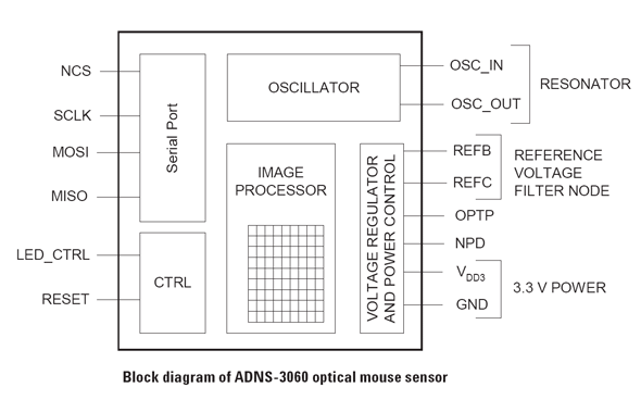 На этом, собственно, все с базовыми принципами работы оптического сенсора. Что еще можно добавить? Рекомендуемая рабочая температура микросхемы ADNS-3060, впрочем как и всех остальных чипов этого рода, — от 0 0С до +40 0С. Хотя сохранение рабочих свойств своих чипов Agilent Technologies гарантирует в диапазоне температур от -40 до +85 °С.