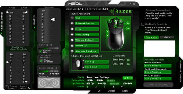 Настройки мощные, претензий быть не может. Разве что стандартных для HID-устройств действий в трёх группах всего 21, могло быть и больше, но зато все безупречно работают и могут быть назначены любой клавише. В том числе и поворотам колеса. Естественным для Razer образом присутствует возможность также назначить кнопке эмуляцию нажатия любой одиночной клавиши на клавиатуре, либо выполнение макроса, который тут же и записывается. А среди стандартных опций есть настройки текущего разрешения и смена профиля.