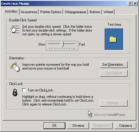 Имеется возможность настройки скорости двойного щелчка мышью, после чего проверить настройку на квадратике с надписью "Test Area", если все пройдет удачно, значок закрытой папки изменится на значок открытой папки. Когда первый раз увидел в панели управления слово "Ориентация", в душу закрались странные подозрения — какая еще может быть ориентация у мыши. Все оказалось предельно просто, не все люди передвигают манипулятор так, как задумывали инженеры. При движении вверх мышь всегда сдвигается чуть-чуть вбок. Это может приводить к не слишком приятной работе, а также ошибкам. Эта опция предназначена для того, чтобы втолковать мыши, где, по вашему мнению, верх, а где низ.