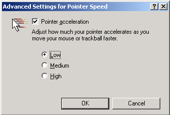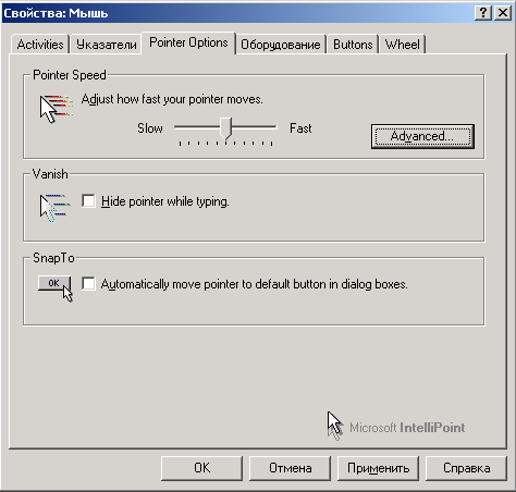 На закладке "Pointer Options" есть возможность отрегулировать скорость движения мыши, а также задать степень ускорения курсора мыши при резких движениях. Эта опция очень помогает при обычной работе, но подлежит категорическому отключение в игрушках, иначе возможно появление разных неприятных эффектов.