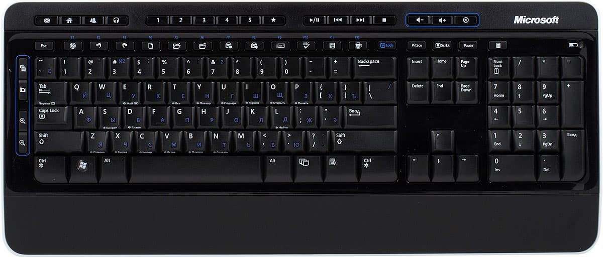 Поскольку клавиатура черная, символы латиницы нанесены белой краской, а кириллицы — синей (как в клавиатурах SVEN). Решение правильное, позволяющие учесть интересы и тех, кто считает, что символы разных раскладок должны иметь разные цвета, и тех, кому просто требуется нормальная читаемость обозначений (чему сочетание «красный на черном», до сих с непонятным упорством используемое некоторыми производителями, не отвечает). Что стало уже доброй традицией, на нижних торцах клавиш нанесены некоторые глобальные шорткаты, выполняемые этой клавишей совместно с Ctrl или Win: опытные пользователи их и без того помнят наизусть, зато для начинающих это будет отличным подспорьем на этапе обучения.