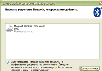 Поиск идёт так: запускаем его с ПК, нажимаем на пять секунд кнопку «Коннект» на брюшке, мышь начинает мигать красными и зелёными огоньками на вершине спинки. Через некоторое время загорается зелёный огонёк, а в панельке поиска находится новое устройство.