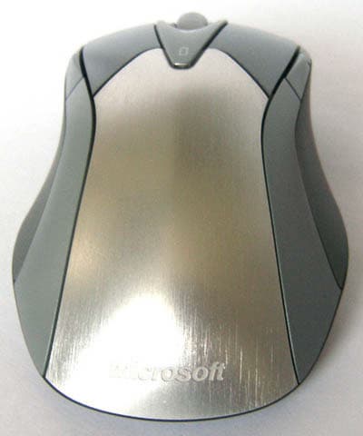 Побывавшая на тестировании модель по общему впечатлению средне-серая, всего использовано в оформлении семь оттенков. Отдельные от спинки кнопочки самая тёмная часть, чуть шершавый тонкий пластик. Обрамление колеса и вставка с боковыми кнопками обычная пластмасса, боковые поверхности с пониженной скользкостью. Венчает дизайн вставка из «пилёного» алюминия (brushed, матовая шлифовка). Оказалось, что она не только прекрасно смотрится, но и удобна при работе приятна на ощупь, рука меньше потеет, несмотря на то, что не скользит, ещё и не липнет к руке. Вместо привычного для мышиной продукции логотипа компании в виде лучей к краям треугольника на задней части полностью вытатуировано название Microsoft. Не знаю, понравится ли мне мышь полностью из алюминия, но на четверть понравилась. Всё вместе, форма и сочетание материалов, почему-то производят до странности «автомобильное» впечатление.
