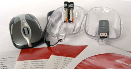 Кроме того в комплекте идёт трансивер Bluetooth, две батарейки формата AAA Energizer, те же инструкции, что и ко всей линейке мышей Laser. Диск с драйверами без русской версии и отдельная листовка о том, что мышь с ними работать не будет, и придётся качать более свежую версию с сайта компании. Все надписи на коробке переведены на русский.