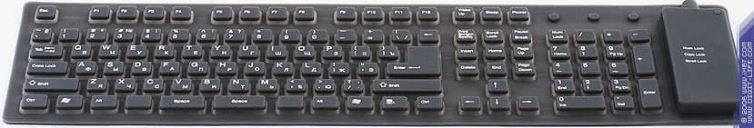 Итак, как мы можем избавиться от указанных выше недостатков? Очевидный вывод — клавиатура должна быть мягкой, дабы для транспортировки или хранения ее можно было свернуть/сложить и сэкономить место, и герметичной, дабы никакая гадость не могла попасть внутрь и повредить тонкую механику и электронику. Сегодняшний уровень технологий вполне способен это обеспечить, но, естественно, путем отказа от привычных материалов изготовления корпуса клавиатуры и кнопок и стандартных механизмов возврата клавиш. Собственно, это мы и наблюдаем в изучаемой сегодня клавиатуре. Основание — достаточно тонкое из двух листов резиноподобного полимера (судя по ощущениям, это все-таки не сама резина, хотя и такой вариант возможен — химический анализ мы не проводили :)), в котором и скрывается матрица клавиш. К сожалению, идеально плоская клавиатура невозможна, поскольку некоторые элементы имеют определенную толщину, существенно отличную от нуля (собственно контроллер, например). Для их размещения предусмотрено утолщение «корпуса» с одной из сторон (модель на самом деле не одна, а целое их семейство). Там же расположены и светодиодные индикаторы — теоретически можно было бы попробовать найти плоские их модели и расположить в стандартном для обычных клавиатур месте, на практике же это не необходимо, так что основным результатом подобного явилось бы только увеличение цены клавиатуры и ничего более.