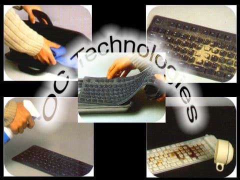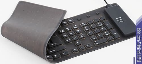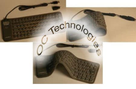 Контакты такие же, как и в мембранных клавиатурах, но механизм возврата и сами кнопки пришлось, разумеется, переделать. Выполнены они достаточно элегантным образом — силиконовая подушечка с прилепленным сверху относительно жестким материалом, аналогичным примененному для изготовления «корпуса». Стоит отметить, что встречаются среди гибких и совсем мягкие клавиатуры: специальный гель заполняет достаточно тонкостенную пленку, никаких средств для увеличения жесткости верхней поверхности клавиш не предусмотрено. Положительным в используемом OCTechnologies варианте является большее удобство (совсем мягкие кнопки не слишком удобно, да и просто не всегда приятно нажимать) и несколько более высокая устойчивость клавиатуры к механическим воздействиям, отрицательным — шума может быть больше, чем в случае гелевой клавиатуры (если сильно бить по клавишам, слышны их щелчки о «днище»). Собственно, и все, что касается именно технологических особенностей.