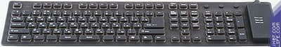Вторым достоинством является хорошая защищенность от внешних воздействий: «обычные» клавиатуры имеют не герметичную конструкцию, «гибкие» герметичны. Соответственно, имеем как минимум полную защиту от пыли, чего нередко уже достаточно. Переверните клавиатуру и потрясите — получите на рабочем столе кучку мусора. Даже в случае домашнего использования или в офисе — в более тяжелых случаях (например, на производстве) запыленность воздуха может оказаться такой, что клавиатура будет не только заполняться мусором, но и просто откажется через некоторое время работать. «Гибкой» модели это никак не грозит — сколь бы ни были неблагоприятны условия, максимум, что потребуется изредка делать, это протирать устройство влажной тряпочкой. Не потому, что иначе оно может сломаться, а просто — чтобы пальцам удобнее было :)