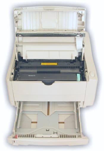 Откинув верхнюю крышку принтера, получаем доступ к картриджу принтера. Замена его — дело минутное и интуитивно понятное. Впрочем, на самом картридже стоит остановиться несколько подробнее: те, кто в целях экономии занимаются заправкой картриджей лазерных принтеров от других производителей самостоятельно или заказывают такую услугу на стороне за деньги, при переходе к эксплуатации OKI B4200L могут вздохнуть с облегчением: контейнер с тонером у картриджа этого принтера сменный, как и у предыдущих монохромников от OKI, сама операция проста, непыльна и доступна самому неискушенному в «железячных делах» пользователю.
