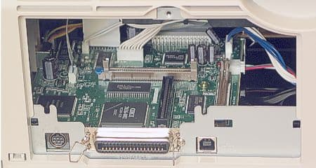 Вся электроника принтера размещена на плате с тыльной стороны корпуса, именно на ней установлены интерфейсные разъемы.