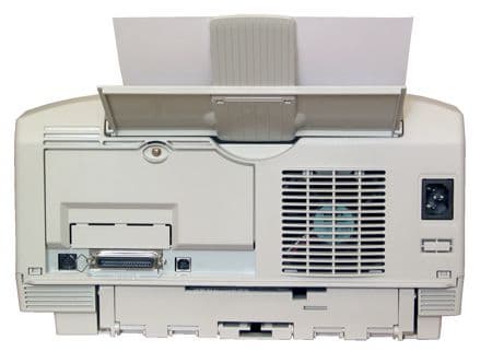 Интерфейсы принтера, разъем для подключения интерфейса дополнительного лотка, равно как и разъем для подключения силового кабеля, традиционно расположены на тыльной стороне принтера.