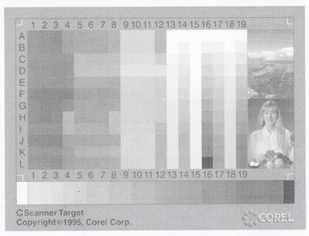 - Распечатка универсальной тестовой таблицы (здесь — файл-оригинал в векторном формате CDR программы Corel Draw). Таблица несколько подработана и усовершенствована, специально для тестирования качества печати градиентной заливки и векторной графики. Например, в растровом градиентном модуле применена заливка в 512 шагов (а не 128, как обычно).