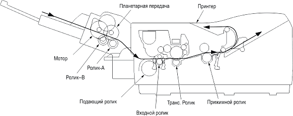 Как видите, предусмотрен выход отпечатков как в верхний приемный лоток, с перегибом, так и по прямой, в задний лоток.
