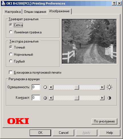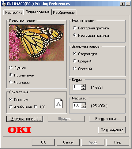 Набор закладок драйвера заданий опций печати принтера OKI B4200L достаточно стандартен для моделей такого класса и содержит все необходимое для работы. Первая закладка «Настройка» посвящена установкам размера бумаги и источника носителя, режиму вывода.