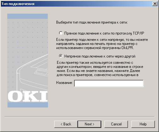 Далее процесс проходит как по нотам, лишь правильно укажите тип сетевого подключения принтера и саму сеть. Поскольку LAN-интерфейс у принтера не предусмотрен, к сети он подключается через один из компьютеров.