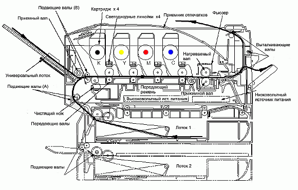 Впрочем, от своих старших собратьев серии C7000 модели C5000 переняли еще одно, доселе незамеченное у принтеров других компаний этого класса качество: возможность распечатки материалов длиной до 1200 мм. Разумеется, для моделей с барабанным расположением картриджей поддержка такой функции не возможна принципиально. Как и старшие модели, принтеры серии C5000 обладают автоматической балансировкой цвета, что гарантирует стабильное воспроизведение цвета первого и последнего отпечатка. Ввиду того, что в целом механизм принтеров серии C5000 схож с конструкцией старших моделей, приведу здесь схематический чертеж, публиковавшийся в статье об OKI C7500.