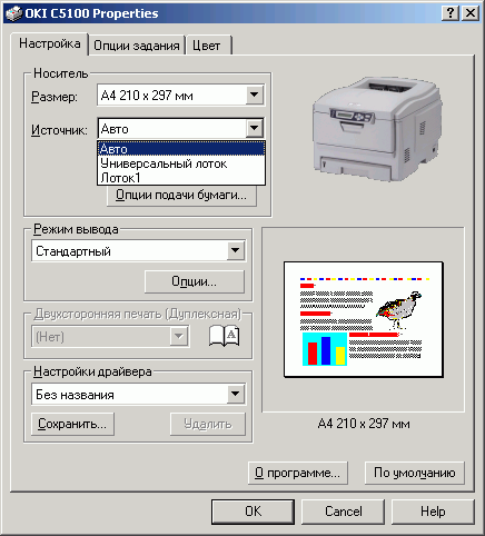 При всем при том, что OKI C5100n — всего лишь GDI-принтер, количество всевозможных настроек в его интерактивном меню — на зависть более продвинутым моделям от конкурентов. Первая закладка «Настройка» посвящена установкам размера бумаги и источника носителя, режиму работы модуля дуплекса, назначению последовательности подачи страниц.