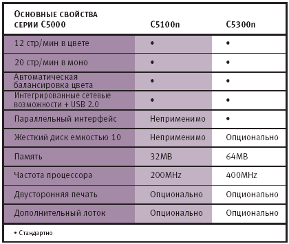 В чем разница между моделями C5100n и C5300n? Первая — это Windows-принтер, GDI-модель, где основная вычислительная нагрузка ложится на процессор вашего ПК. C5300n — это принтер на 400 МГц процессоре со своими собственными вычислительными способностями. C5300n совместим со всеми основными операционными системами, имеет встроенную эмуляцию PCL5c и PostScript 3, плюс, эмулирует Epson FX и IBM ProPrinter Dot Matrix. Основные характерные свойства моделей серии OKI C5000 приведены в таблице ниже: