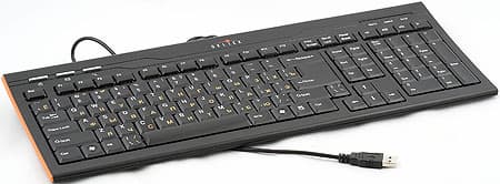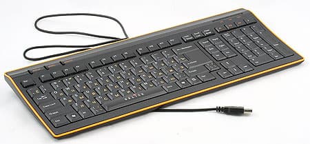 Начнем с модели с меньшим номером, хотя, как будет показано далее, можно было бы и наоборот. Итак, что собой представляет модель 420М? Несмотря на то, что она относится к среднему классу, корпус клавиатуры достаточно компактен и раскладка, соответственно, модифицирована. Последнее понравится далеко не всем пользователям, однако на сегодняшний день это стало достаточно привычным явлением. Традиционная «стандартная» клавиатура с небольшим количеством дополнительных кнопок. Несколько выделяют модель на общем фоне лишь две вещи: небольшая вогнутость корпуса (что многим позволит не использовать раскладывающиеся ножки — задний край клавиатуры и без них несколько приподнят) и вставки из оранжевой резины по бокам. Это неплохо сочетается с черным цветом самой клавиатуры и оранжевыми символами кириллицы на клавишах (очень хорошее сочетание, все более активно используемое всеми производителями, вместо крайне неудачных красных букв на черном фоне). В принципе, как нам кажется, тему оранжевого цвета имело бы смысл продолжить, сделав такими и светодиоды состояния клавиш-модификаторов — в текущей версии они синие, причем расположены под черной полупрозрачной пластмассовой вставкой, так что видны достаточно плохо.