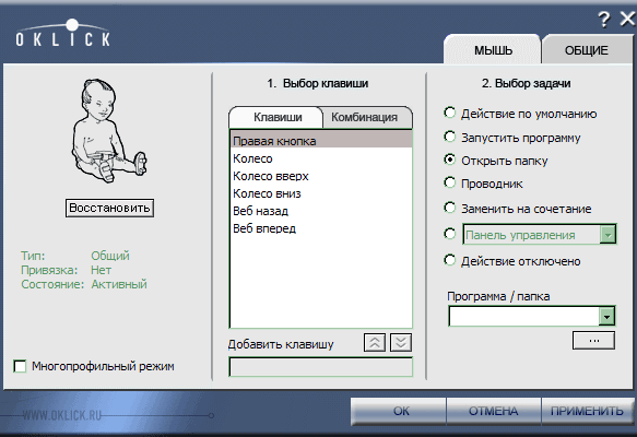 Вообще говоря, набор органов управления «четыре кнопки + колесико-кнопка» полностью поддерживается Windows и другими операционными системами уже давно, так что необходимости в установке какого-либо дополнительного программного обеспечения для таких мышей (а к ним и Oklick 625M относится) нет. Все будет работать и при использовании стандартного драйвера, причем так, как задумано тем, кто писал операционную систему. Но вот желание изменить задуманное возникнуть может. Например, боковая кнопка «Назад» достаточно удобна и полезна — используется при серфинге весьма активно, а ее наличие на мыши позволяет не тянуться к клавиатуре. А вот про кнопку «Вперед» такого уже не скажешь — по статистике используется настолько редко, что жалко для такой операции одну из всего пяти мышиных кнопок отдавать. Но в Windows пока о возможности настройки кнопок средствами ОС не задумались (в этом плане пользователям MacOS повезло намного больше — там поддерживается до 16 кнопок, причем с возможностью настройки), так что для решения этой задачи необходимо устанавливать специальное программное обеспечение. Что ж — у Oklick такой пакет есть, причем универсальный для всех продуктов компании и весьма неплохой. Возможности S- Key по работе с клавиатурами мы уже изучали, теперь настало время посмотреть, что там с мышами.