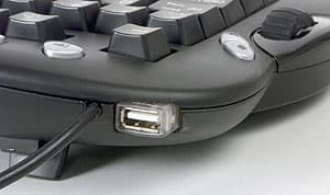Чем же нам в данном случае могут помочь описываемые сегодня модели клавиатур? Как раз наличием USB-порта прямо «на себе». При этом речь идет не о хабе — порт один, а сама клавиатура имеет стандартный для недорогих моделей интерфейс PS/2. По сути, в них просто встроен USB-удлинитель, а интерфейсный кабель представляет собой два независимых (но упакованных в общую оболочку) провода, заканчивающиеся собственными вилками USB и mini-DIN. Такой вариант увеличивает цену устройства лишь на несколько центов, но выполняет то, что от него требуется — USB-порт под рукой и безо всяких лишних проводов на столе. Причем порт полноскоростной (разумеется, в том случае, если вы не подключите соответствующий разъем к порту USB 1.1 на старой материнской плате) и не накладывающий дополнительных ограничений на производительность или энергопотребление подключаемых к нему устройств (в отличие от хаба). Просто, удобно, элегантно и на цене практически не сказывается.