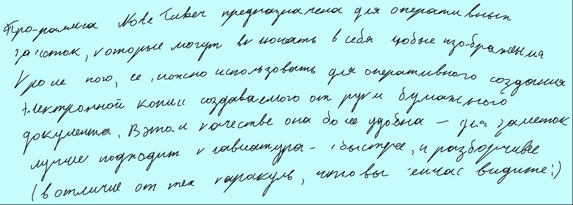 Любит висеть в качестве фонового процесса, до тех пор, пока мы не начнем что-либо рисовать или писать. Определяет этот момент легко — в отличие от планшетов, которых пером даже необязательно касаться (поскольку электромагнитное поле действует и на некоторой высоте над рабочей областью), цифровая ручка посылает сигналы приемнику только в тот момент, когда ею действительно что-то пишут или рисуют, определяя это, по-видимому, по факту нажатия на стержень. К этому следует некоторое время привыкнуть, особенно если вы собираетесь что-то писать — выше приведен специально сохраненный первый мой опыт (что там написано проще всего увидеть на сохраненной средствами программы картинке) ;) Видно, что используется прямое отображение всего листа А4 на свой электронный образ, в то время, как в случае планшетов обычно применяется соответствие рабочей области рабочему столу. Хорошая иллюстрация разных принципов работы: графический манипулятор, работающий со всеми программами, и выдающий результат, зависящий от самих программ, и устройство, ориентированное на ввод в компьютер текстово-графических заметок (что даже в названии отображено).
