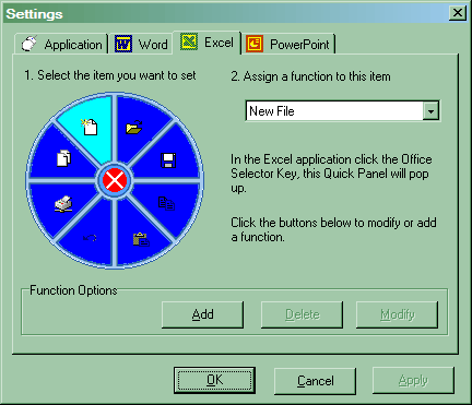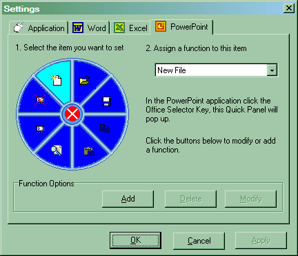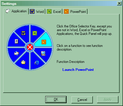 Первый вариант — меню «Application», появляющееся при нажатии шестой кнопки над любой областью рабочего стола, отличной от окна Word, Excel и PowerPoint. Центральная часть меню позволяет его закрыть, остальные секторы имеют следующие назначения (от 12 часов по часовой стрелке): запуск Excel, запуск PowerPoint, открытие папки «Мой компьютер», запуск Интернет-браузера по-умолчанию (хоть она и называется «Internet Explorer», но к альтернативным программам относится вполне корректно), доступ к папке «Мои документы», запуск почтовой программы по-умолчанию (называется «Outlook Express», однако, подобно браузерной, продукцией Microsoft совсем не ограничивается), регулятор громкости, запуск Word. Все операции достаточно часто востребованные, так что единственной претензией к первому меню является то, что его никак нельзя настроить под свои нужды.