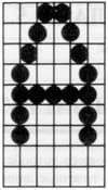 Вот так выглядит буква "A" для 9-игольчатого матричного принтера Star-NX1500. Как видно, матрица символа имеет размер 6x9 ячеек, при этом точки могут быть расположены не только внутри ячеек, но и между ними. Высота матрицы совпадает с количеством игл принтера, что позволяет печатать одну строку символов за один проход печатающей головки. Соответственно, для 24-игольчатых принтеров матрица имеет высоту в 24 ячейки, что позволяет улучшить изображение символов.