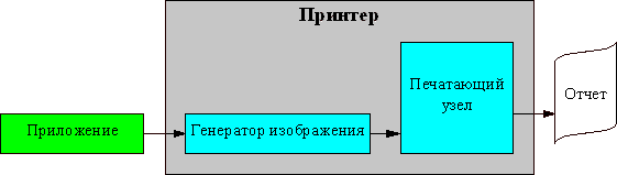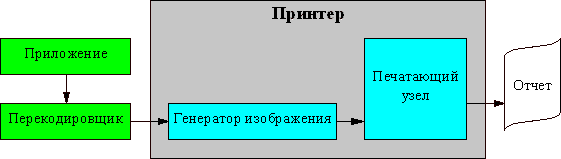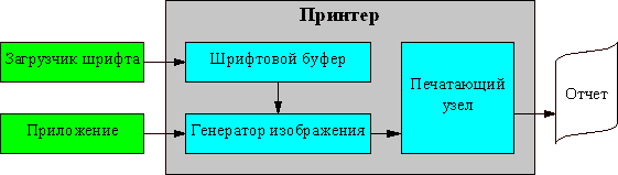 На рисунке схематично показан процесс печати в кодах на русифицированном принтере. Все, что нужно сделать прикладной программе — послать на принтер последовательность кодов символов. Принтер генерирует изображение согласно встроенной в него кодовой таблице и передает его на печатающий узел. Практически все матричные и струйные принтеры аппаратно русифицированы.